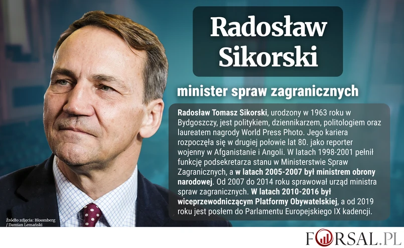 Radosław Tomasz Sikorski, urodzony w 1963 roku w Bydgoszczy, jest politykiem, dziennikarzem, politologiem oraz laureatem nagrody World Press Photo. Jego kariera rozpoczęła się w drugiej połowie lat 80. jako reporter wojenny w Afganistanie i Angoli. W latach 1998-2001 pełnił funkcję podsekretarza stanu w Ministerstwie Spraw Zagranicznych, a w latach 2005-2007 był ministrem obrony narodowej. Od 2007 do 2014 roku sprawował urząd ministra spraw zagranicznych. W latach 2010-2016 był wiceprzewodniczącym Platformy Obywatelskiej, a od 2019 roku jest posłem do Parlamentu Europejskiego IX kadencji.