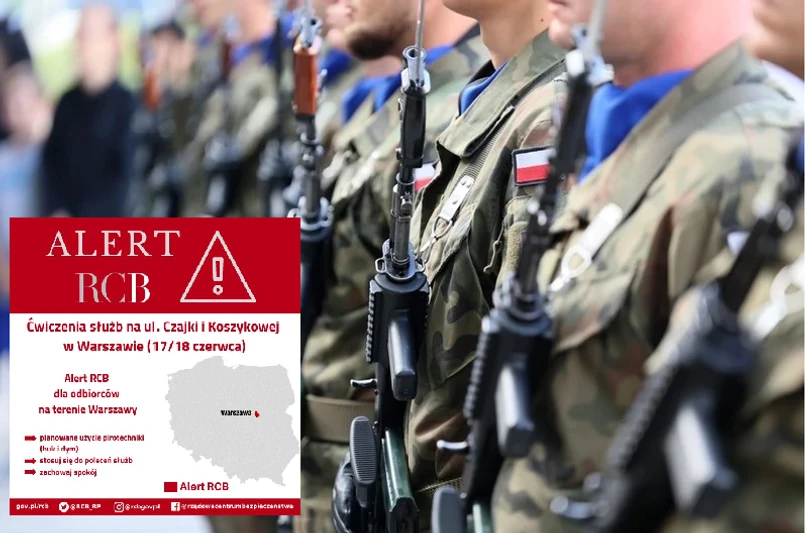 Mieszkańcy stolicy i okolic otrzymali dziś alerty Rządowego Centrum Bezpieczeństwa o ćwiczeniach służb z użyciem pirotechniki. Ostrzegają przed wystąpieniem hałasów ("huk") i dymu. Ćwiczenia odbędą się 17.06 (poniedziałek) i 18.06 (wtorek) na ul. Czajki i Koszykowej w Warszawie. Rządowe Centrum Bezpieczeństwa apeluje o zachowanie spokoju i stosowanie się do poleceń służb.