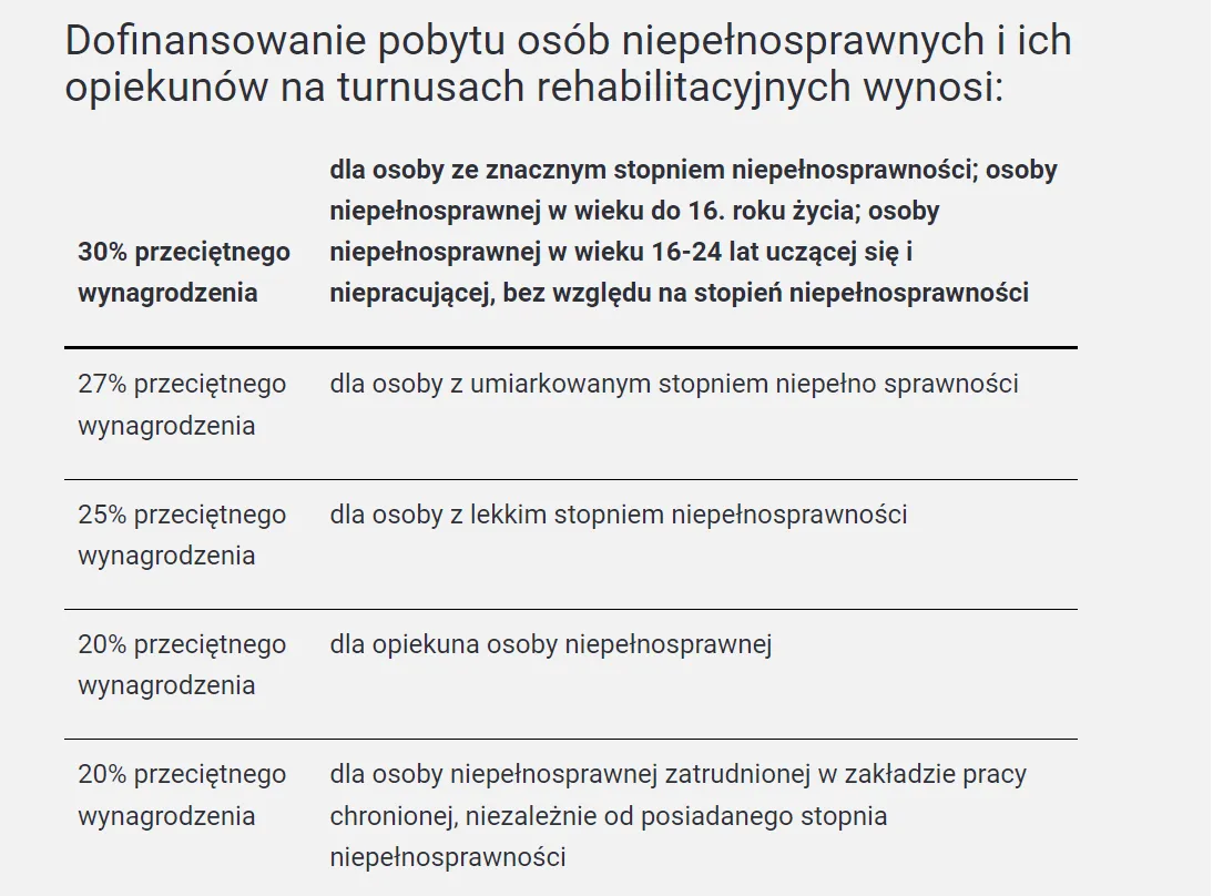 Osoba z niepełnosprawnością, posiadające orzeczenie, ubiegając się o dofinasowanie do turnusu rehabilitacyjnego musi spełniać kryterium dochodowe. Przeciętny miesięczny dochód, w rozumieniu przepisów o świadczeniach rodzinnych, podzielony przez liczbę osób we wspólnym gospodarstwie domowym, obliczony za kwartał poprzedzający miesiąc złożenia wniosku, nie przekracza kwoty: 50% przeciętnego wynagrodzenia na osobę we wspólnym gospodarstwie domowym, 65% przeciętnego wynagrodzenia w przypadku osoby samotnej.