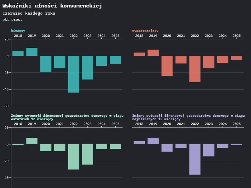 „W czerwcu 2025 r. odnotowano poprawę zarówno obecnych, jak i przyszłych nastrojów konsumenckich w stosunku do poprzedniego miesiąca” – podał w środę Główny Urząd Statystyczny. Suchy komunikat mówi, że zarówno tzw. bieżący wskaźnik ufności, jak i wskaźnik wyprzedzający są w czerwcu na minusie, co oznacza, że odpowiedzi pesymistycznych jest więcej niż optymistycznych. Wskaźnik mówiący o ocenach obecnej sytuacji znalazł się na poziomie -9,3 pkt, o 5,2 pkt wyższym niż miesiąc wcześniej. Wskaźnik biorący pod uwagę przewidywania konsumentów na najbliższe 12 miesięcy wyniósł -4,6 pkt. To o 4,3 pkt więcej niż w maju.