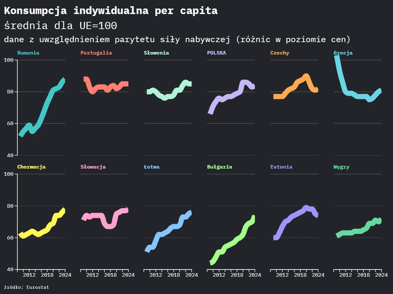A są kraje, które w czasie naszego zastoju systematycznie pną się w górę. My na przełomie poprzedniej dekady dogoniliśmy i w konsumpcji, i w PKB w przeliczeniu na mieszkańca Portugalię i od tego czasu wymieniamy się miejscami (według ostatnich danych górą jest kraj z Półwyspu Iberyjskiego). Sami zostaliśmy wyprzedzeni przez Rumunię. To kraj, który w ostatnich latach dokonał jednego z największych skoków poziomu konsumpcji w Europie Środkowej i Wschodniej. Szybsze doganianie średniej było jedynie udziałem Bułgarów. Ci jednak, żeby osiągnąć średni poziom unijny, musieliby konsumować o jedną trzecią więcej niż 2024 r.