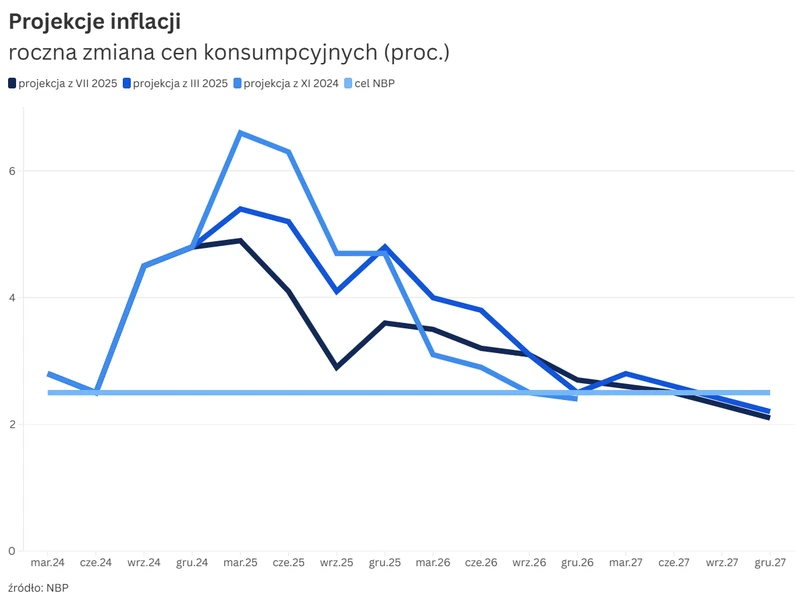 Mimo to od I kwartału 2026 r. będzie już trwale w tym przedziale, a w drugiej połowie 2027 r. byłaby nawet poniżej punktowego celu NBP wynoszącego 2,5 proc. „Byłaby”, bo publikowana projekcja jest przygotowywana przy założeniu braku zmian stóp procentowych, tymczasem w lipcu RPP obniżyła je o 0,25 pkt proc. „Prognozowana na najbliższe lata ścieżka aktywności gospodarczej w kraju i za granicą wskazuje, że w latach 2026-2027 inflacja CPI będzie znajdować się pod coraz silniejszym wpływem słabnącego tempa wzrostu wynagrodzeń, które ze względu na mechanizmy rynkowe oddziałuje z pewnym opóźnieniem na kształtowanie się cen” – podkreśla bank centralny.