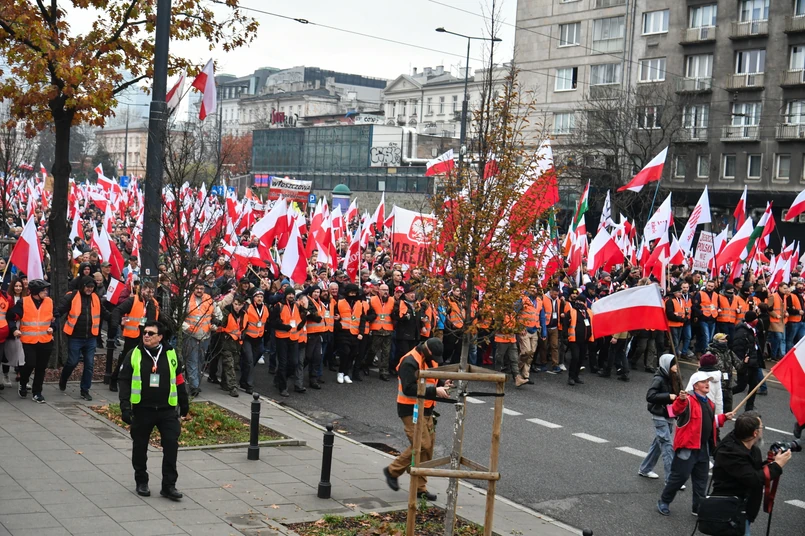 10/18 Warszawa, 11.11.2023. Uczestnicy Marszu Niepodległości w Warszawie