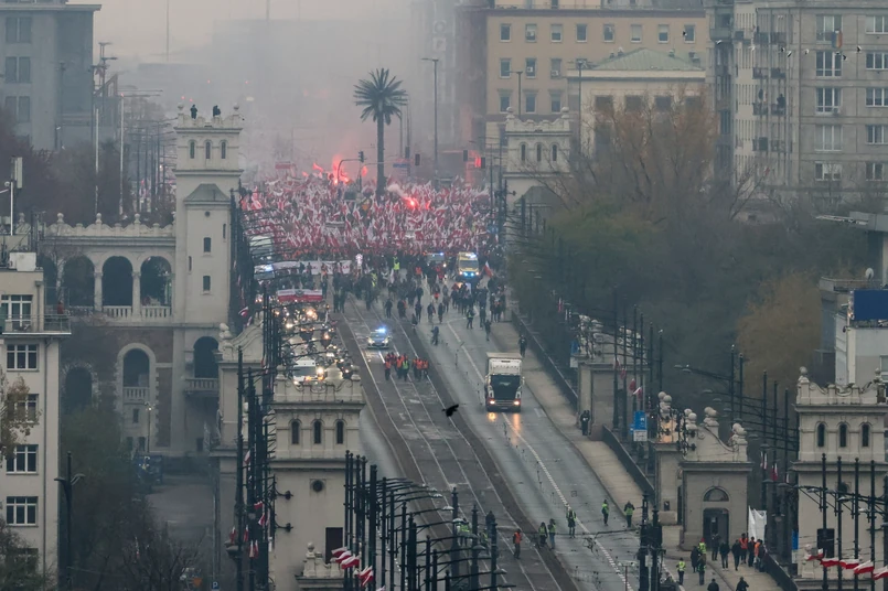 8/18 Warszawa, 11.11.2023. Uczestnicy Marszu Niepodległości na rondzie gen. Charles'a de Gaulle'a w Warszawie