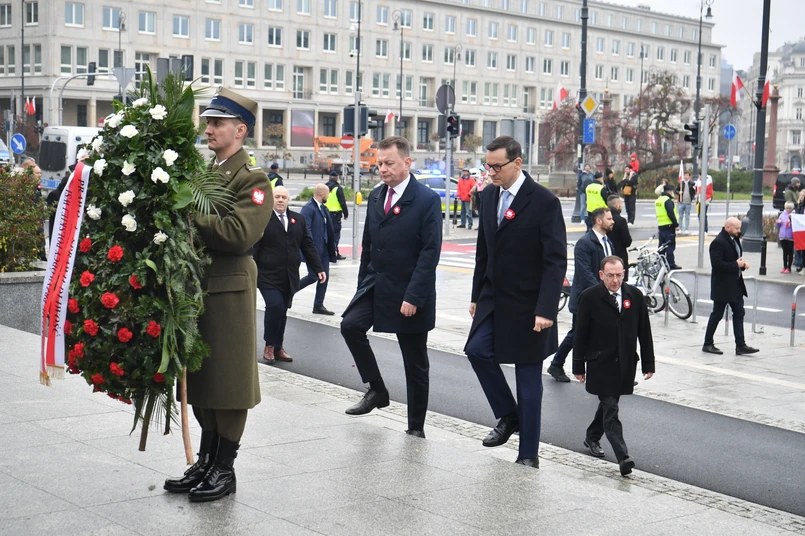 18/22 Obchody Narodowego Święta Niepodległości. Premier Mateusz Morawiecki, minister obrony narodowej Mariusz Błaszczak i minister spraw wewnętrznych i administracji Mariusz Kamiński złożyli wieniec przed pomnikiem Wincentego Witosa przy placu Trzech Krzyży w Warszawie.