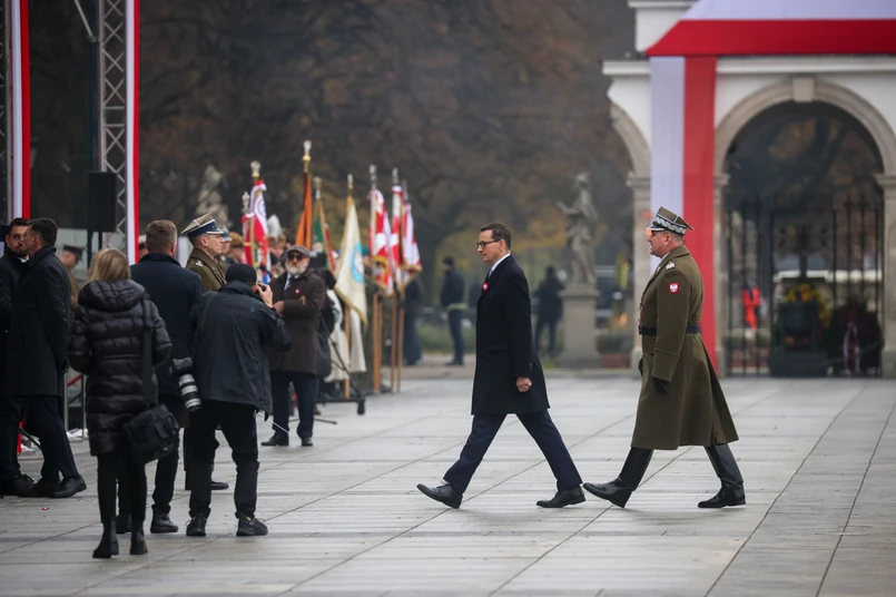 20/22 Obchody Narodowego Święta Niepodległości. Premier Mateusz Morawiecki i dowódca Garnizonu Warszawa gen. bryg. Tomasz Dominikowski na uroczystej odprawie wart przed Grobem Nieznanego Żołnierza na pl. Piłsudskiego w Warszawie.