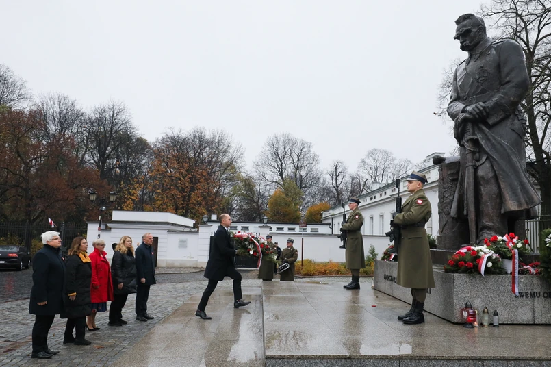 9/22 Obchody Narodowego Święta Niepodległości. Delegacja Klubu Parlamentarnego Koalicji Obywatelskiej, od lewej: poseł Maciej Lasek, wicemarszałek Sejmu RP Małgorzata Kidawa-Błońska, posłanka Joanna Kluzik-Rostkowska, posłanka Katarzyna Piekarska, poseł Czesław Mroczek i poseł Michał Szczerba podczas złożenia wieńca przed pomnikiem marszałka Józefa Piłsudskiego przy Belwederze w Warszawie.