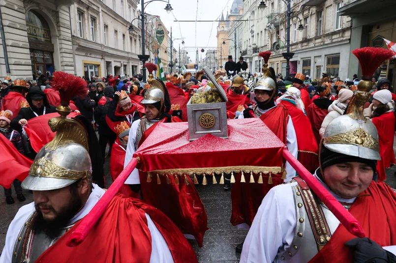 2/5 Orszak Trzech Króli na ulicy Piotrkowskiej w Łodzi. Tegoroczna odsłona Orszaku odbywa się pod hasłem "W Jasełkach leży!".