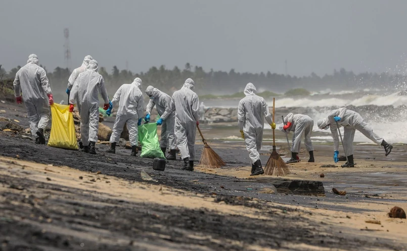 Do sprzątania plaż wysłano tysiące żołnierzy marynarki wojennej w strojach ochronnych.