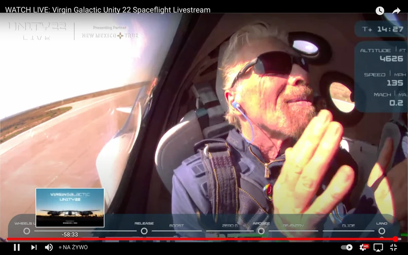 Miliarder wraz z dwoma pilotami i trzema innymi członkami załogi spędził w stanie nieważkości około 4 minut, po czym zaczął schodzenie do lądowania w porcie kosmicznym Virgin Galactic w hrabstwie Sierra w stanie Nowy Meksyk.