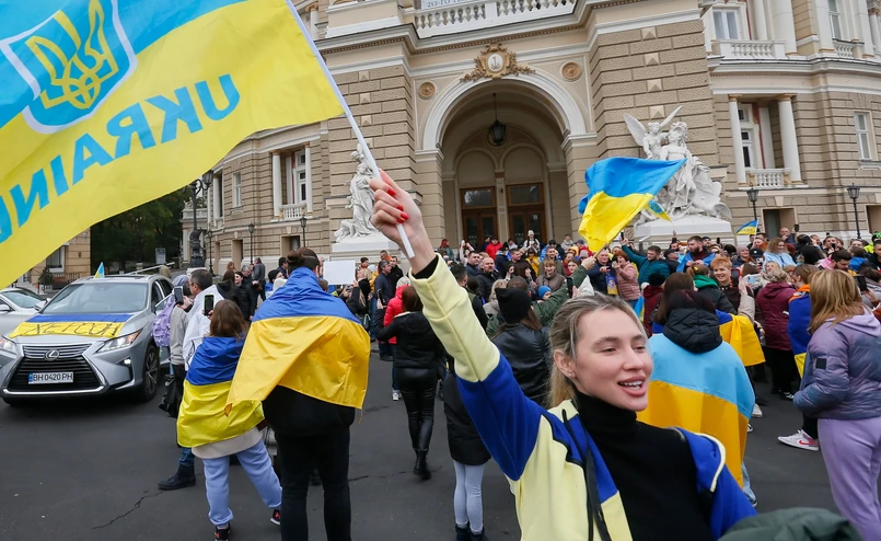 "Miesiące rosyjskiej okupacji, miesiące gnębienia naszych ludzi, miesiące oświadczeń, że Rosja tam rzekomo jest już na zawsze... A na ulicach teraz jest morze ukraińskich flag. Ludzie nie myśleli o tym, by zrezygnować z Ukrainy" - powiedział prezydent.