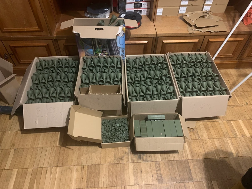 Drukując standardowym Enderem 3 V2, prędkość drukowania to maksymalnie około 150 mm/s. Produkujemy głównie pociski moździerzowe oraz do granatników. Robimy to po godzinach pracy, ale czasem tworzyliśmy pociski przez kilkanaście godzin bez przerw na "cztery ręce i trzy drukarki". Wówczas ładnych kilka kartonów udaje się zapełnić do wysyłki. Liczymy, że ta mała cegiełka będzie uszczelniać mur, który nas chroni przed żołnierzami Putina.