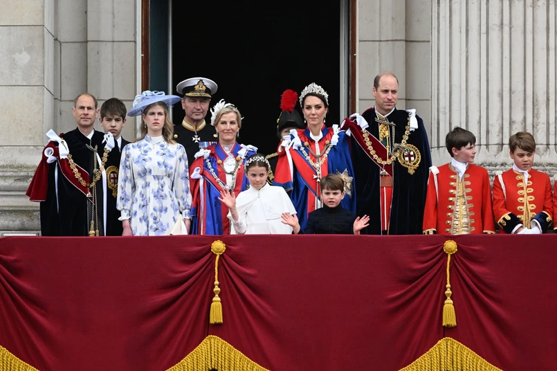 8/8 Ostatnim punktem ceremonii było tradycyjne pojawienie się rodziny królewskiej na balkonie Pałacu Buckingham, skąd pozdrowili zgromadzonych i obserwowali przelot samolotów wojskowych.